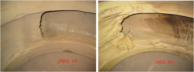 三十多年來(lái),機淤生產(chǎn)一直采用鑄鐵泥漿泵,過(guò)流部件的抗磨蝕性能,是影響其使用壽命主要因素。如近幾年, 機淤生產(chǎn)常采用的10PN-30型鑄鐵泥漿泵,由于過(guò)流介質(zhì)含沙濃度大、顆粒粗 ( 中數粒徑 0.097mm),磨蝕非常嚴重。據應用的17臺10PN-30型鑄鐵泥漿泵統計,一般生產(chǎn)土方3萬(wàn)m3,葉輪及護板磨蝕報廢(如照片1-1),泵殼開(kāi)始穿孔,即使更換葉輪、護板,對泵殼采取補焊等措施,生產(chǎn)土方10萬(wàn)m3左右,整個(gè)泥漿泵報廢。不僅提高了設備投資,而且頻繁的停機換件和維修,還浪費大量的人力,影響有效生產(chǎn)時(shí)間和工效。